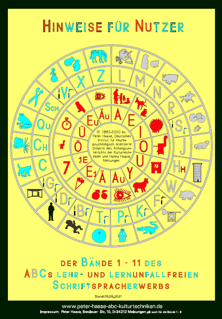 Bd. 4: „ABC lehr- und lernunfallfreien Schriftspracherwerbs - Farbige Handzeichentafeln“ Kopiervorlagen mit jeweils Abbild des Buchstaben-Merkwortes (der zugehörigen Merkwörter), vgl. a. Merkwort-Bilder im Buchstaben-Rad], und Buchstaben/-Laut-Merk-Lieder], wissenschaftlicher Grundlagen dynamischer Handzeichen.